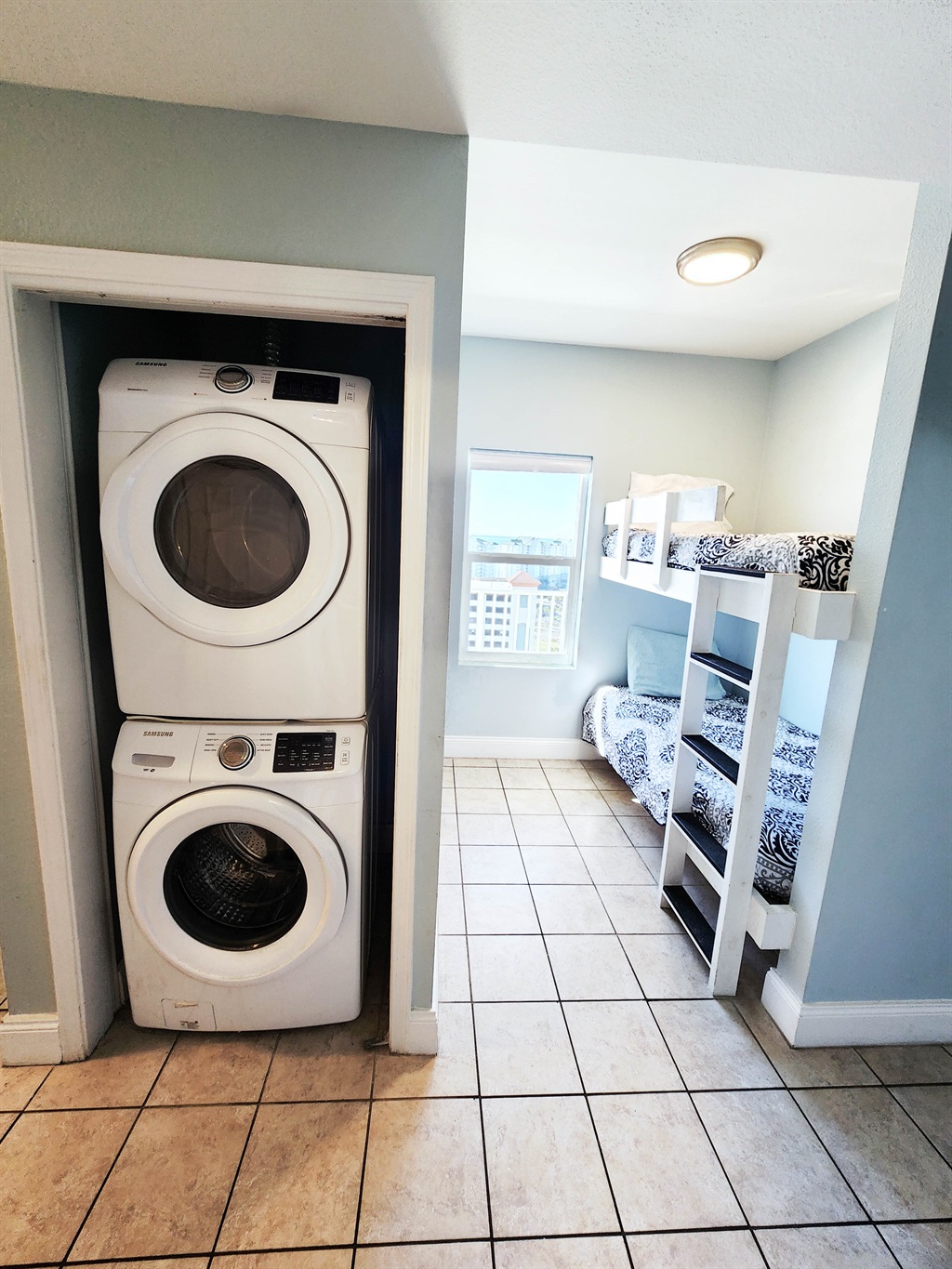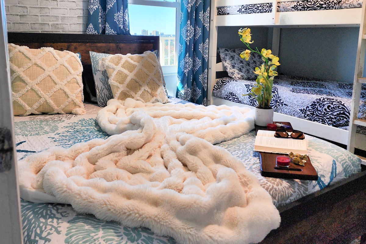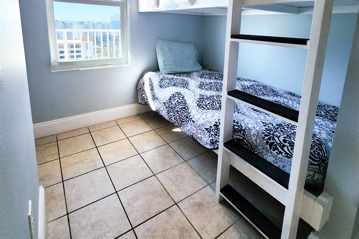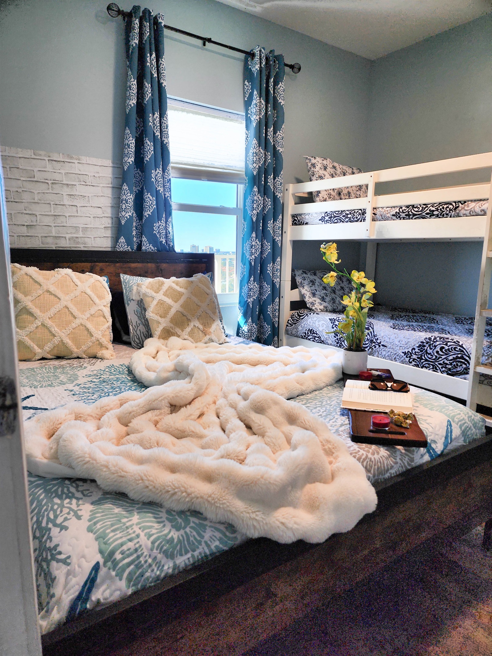 The unit has been beautifully decorated and offers the perfect setting for a beach getaway. You will find this spacious kitchen to flow perfectly with the open and spacious living room. The comfort of the fluffy furniture and the clean design will make you feel at home. The kitchen is very well stocked, it offers anything and everything you may need to cook a three course meal. the bunk area is secluded and has a private bathroom accessible right across. The master suite has the most comfortable bed and perfect shades to guarantee a good night sleep after a long day at the beach. The private master bathroom and extra large closet space complete the perfect ambience for comfortable stay.